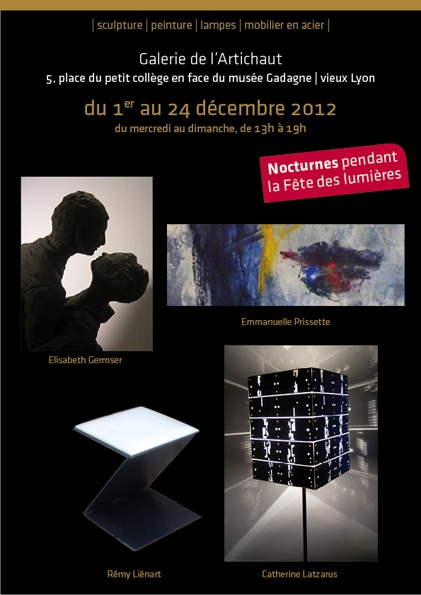 exposition décembre 2012 à Lyon Bonjour à toutes et tous, Voici l’annonce pour l’exposition collective de quatre amis. Venez nous retrouver dans ce lieu magnifique! Vernissage le mercredi 5 décembre à partir de 18h30 Au plaisir de vous revoir, bien à vous, Catherine Latzarus .